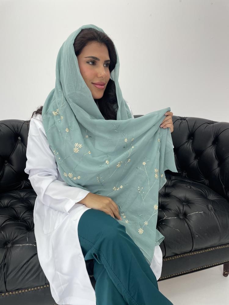 طرحة بوال لون اخضر مطرزه بشكل ورود متناثره على لاطلالة مثالية مميزة و انيقة.
