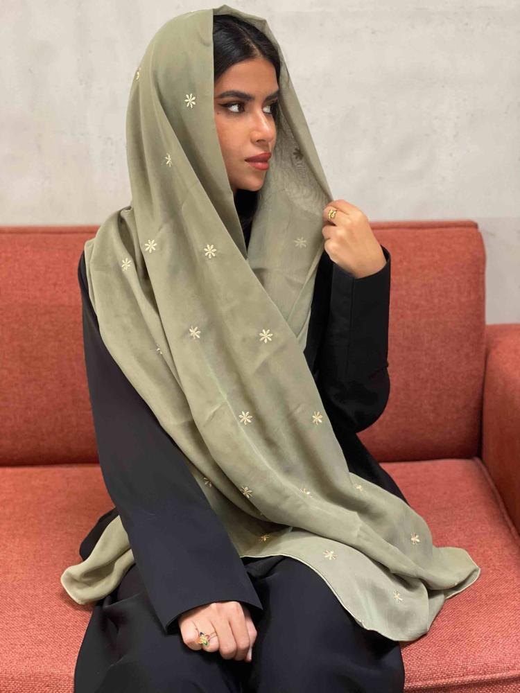 طرحة لون زيتي مزودة بتطريز الورود بخيوط الحرير