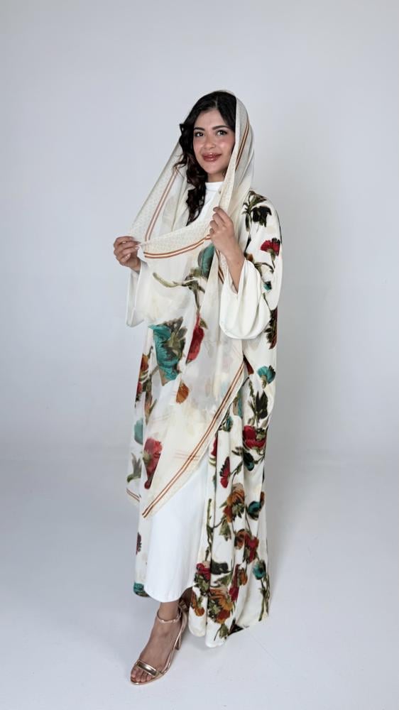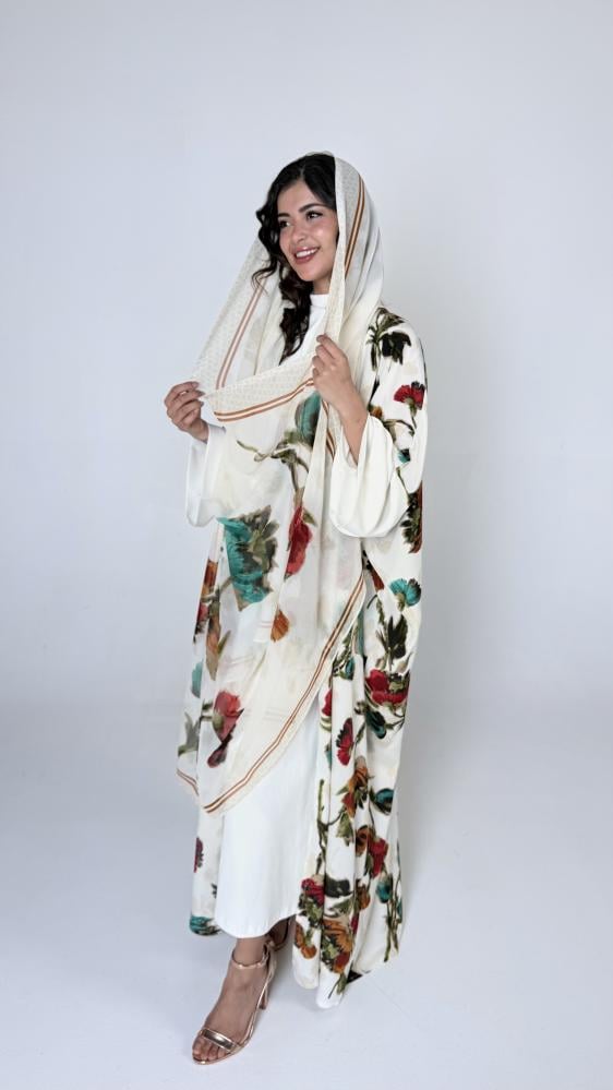 • لوحة فنية من الألوان: نقوش الزهور التي تجمع بين الأحمر الدافئ، التركواز المنعش، والبيج الكلاسيكي على خلفية بيضاء تجعلكِ تتألقين في تجمعاتك الصباحية.