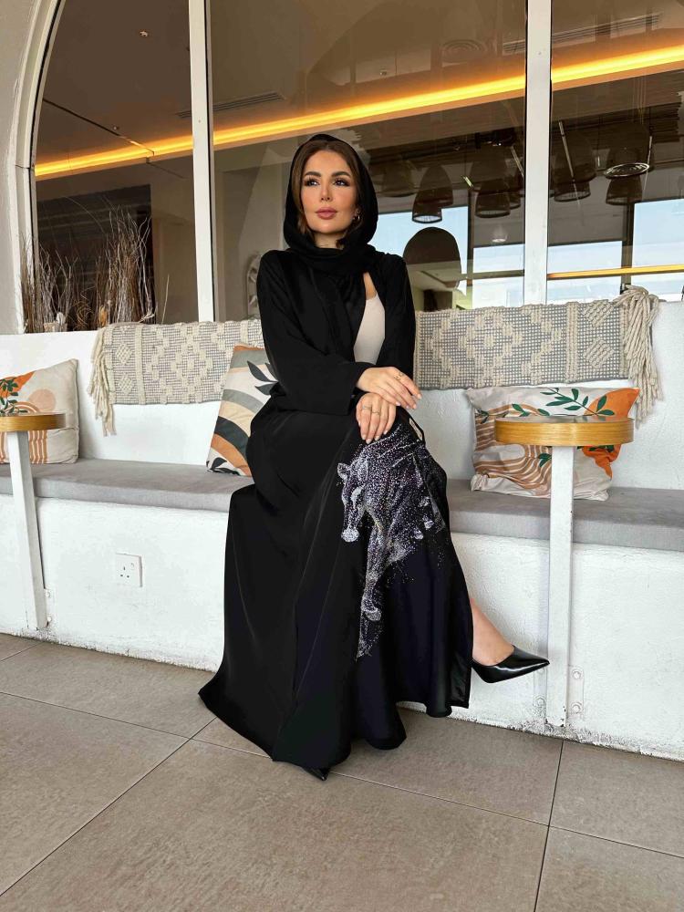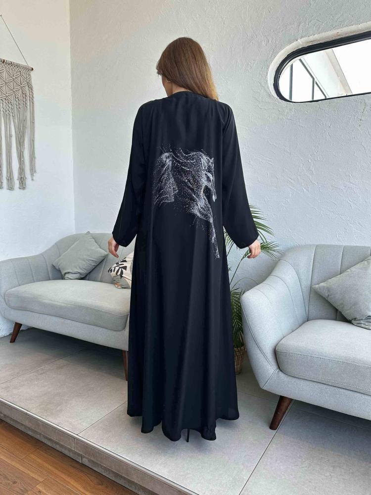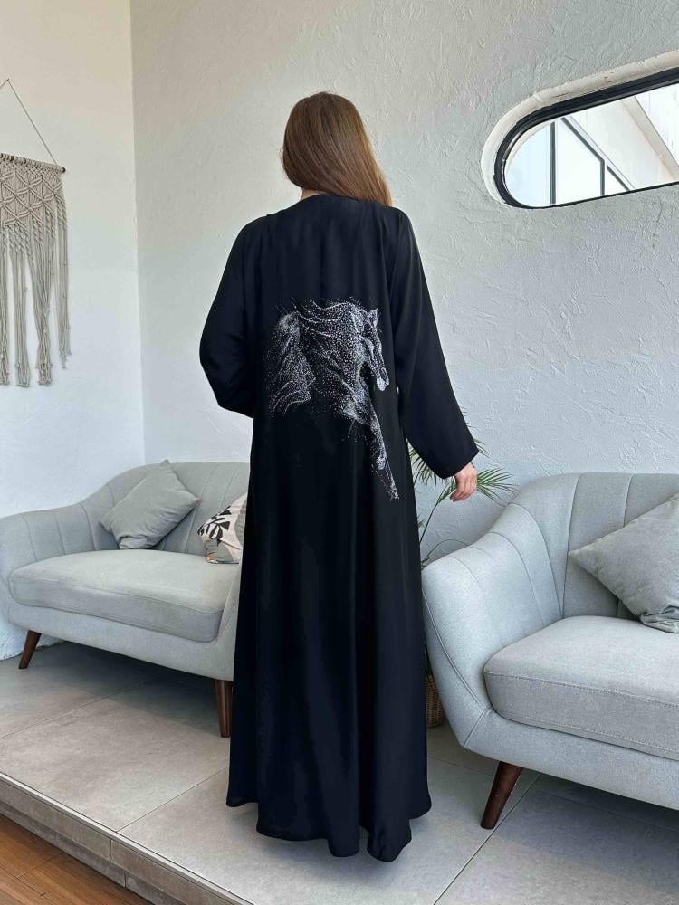 عباية مخصصة لمحبي العبايات المميزة عبايه سوداء بقماش مطرز على شكل فرس من الخلف ومن الامام وبكم مميز مطرز على شكل فرس مع طرحه سوداء