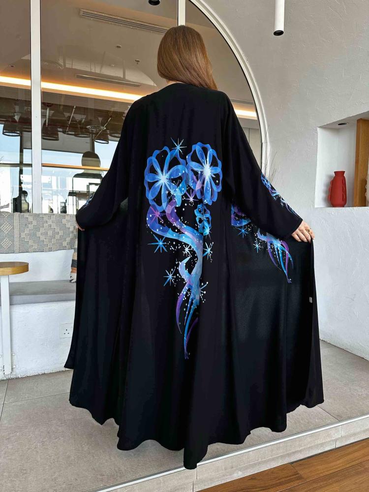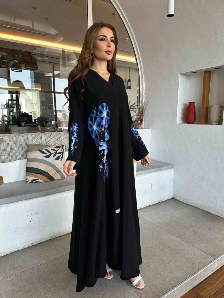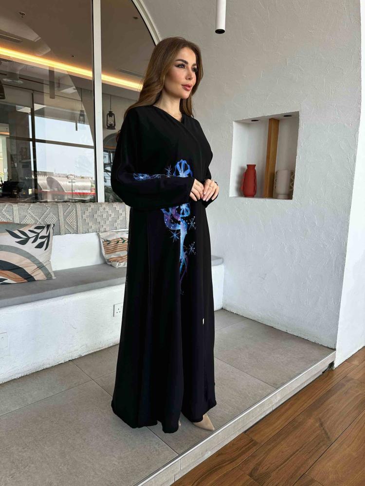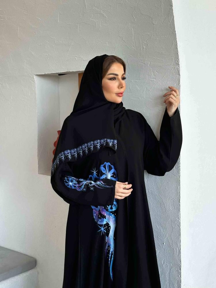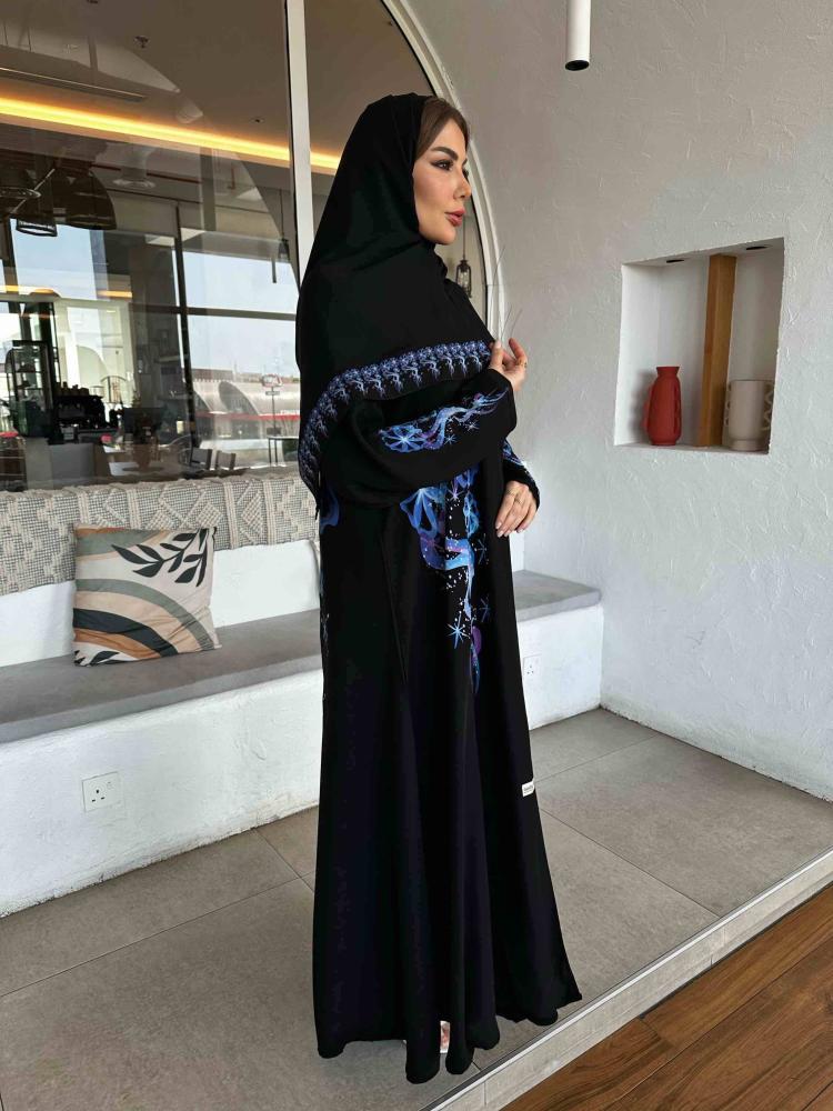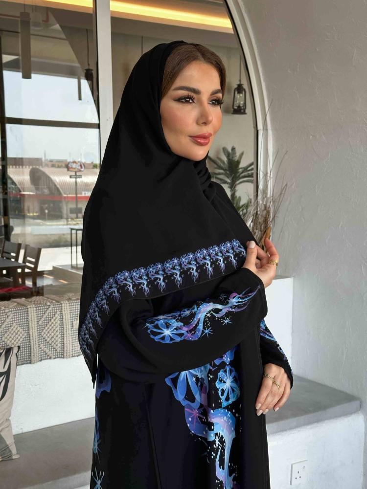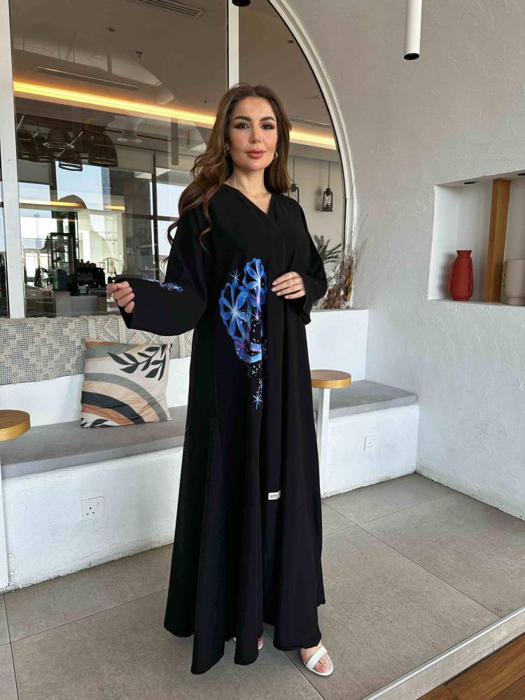 لمحبي العبايات المميزة عبايه سوداء بقماش مطرز بالورود من الاسفل وبكم مميز مطرز بشكل وردات ملونه مع طرحه مطرزه ايضا من الامام