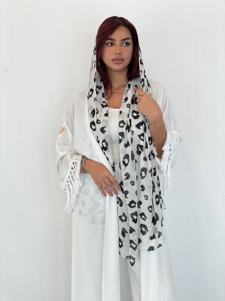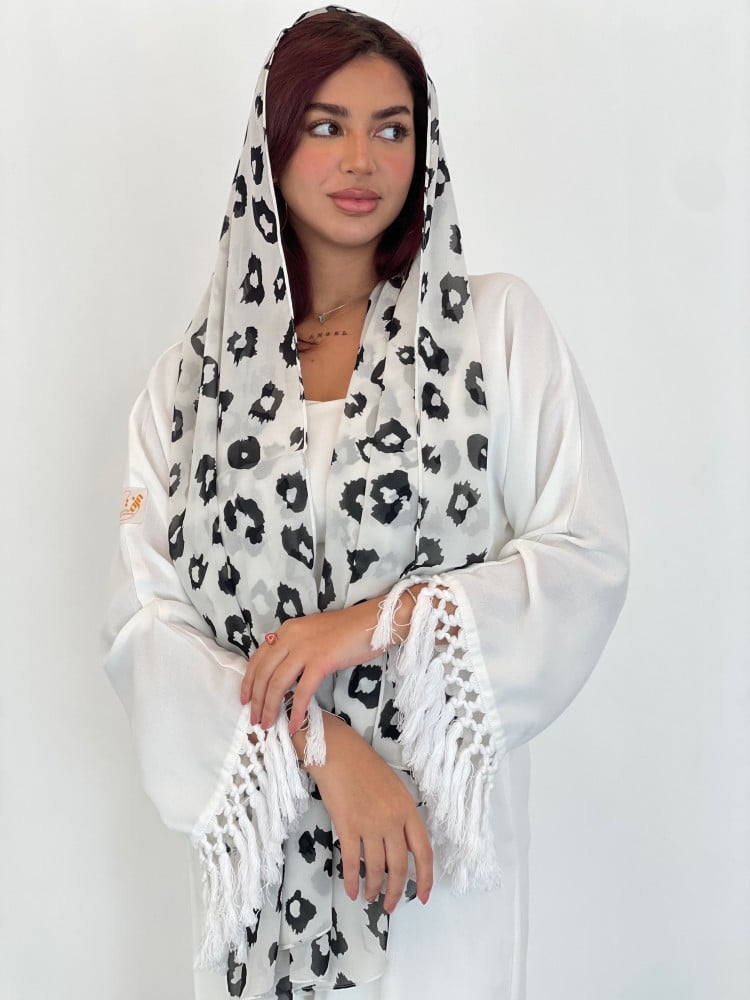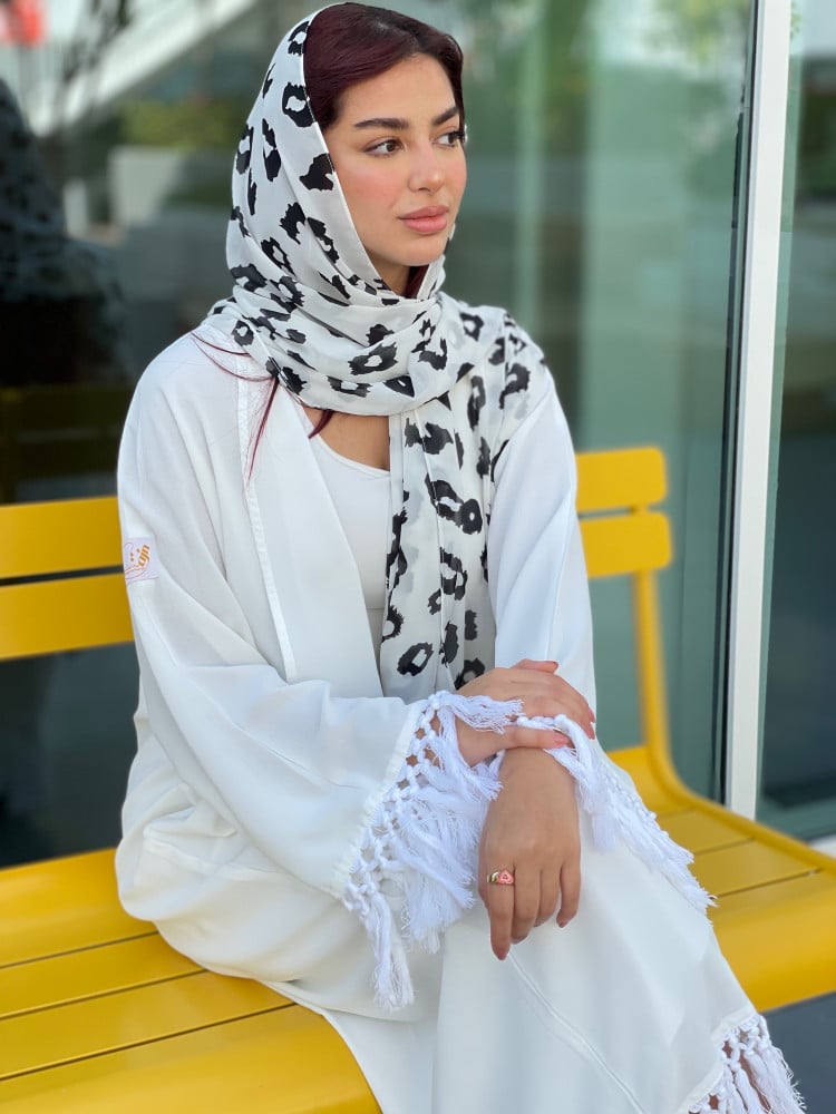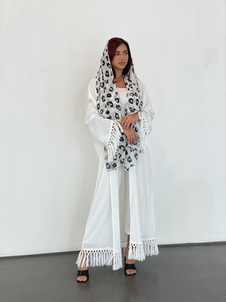 عبايه بيضاء بقصه رائعه بقماش صيفي خفيف ومريح بكلفه من الخيوط المنسدله على الاكمام ومن اسفل العبايه مع طرحة بديلة مشجرة