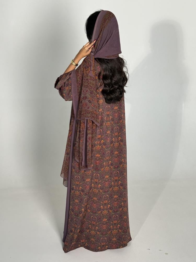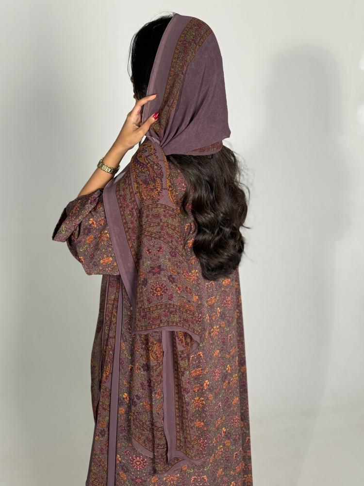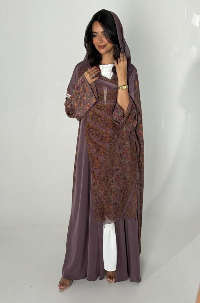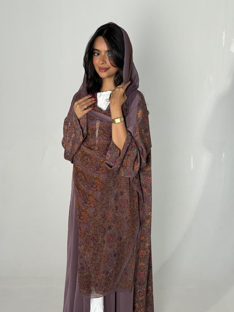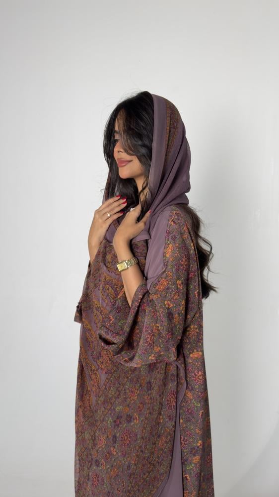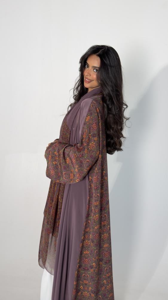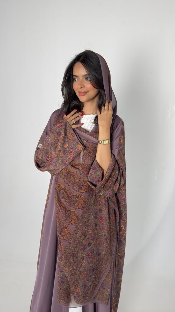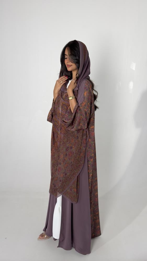• اكتشفي أناقة عبايات حرير العملية مع هذه العباية الموف الرائعة.