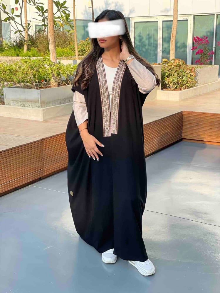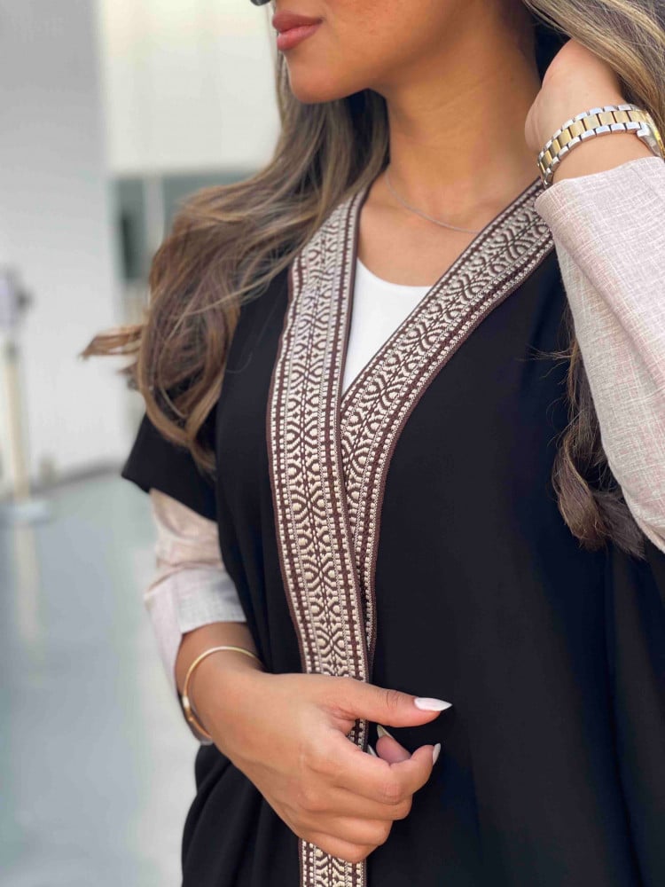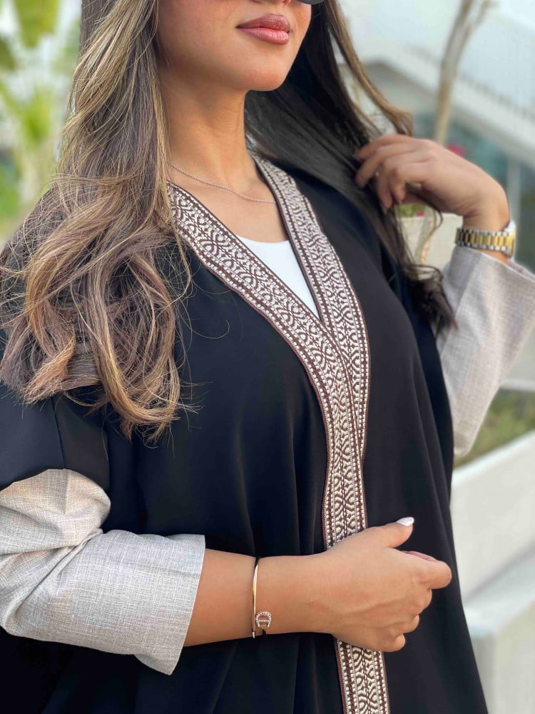 عبايه سوداء بقصه رائعه واسعه قليلا بقماش عملي مريح بكلفة من الامام مزينه باللون البيج مع البني واكمام رائعة باللون البيج مع طرحه باللون الاسود بطرف بيج من الامام