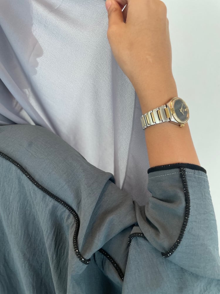 عباية يومية أنيقة باللون الرمادي باكسسوار ناعم على كامل الكم من عزة المتميزة