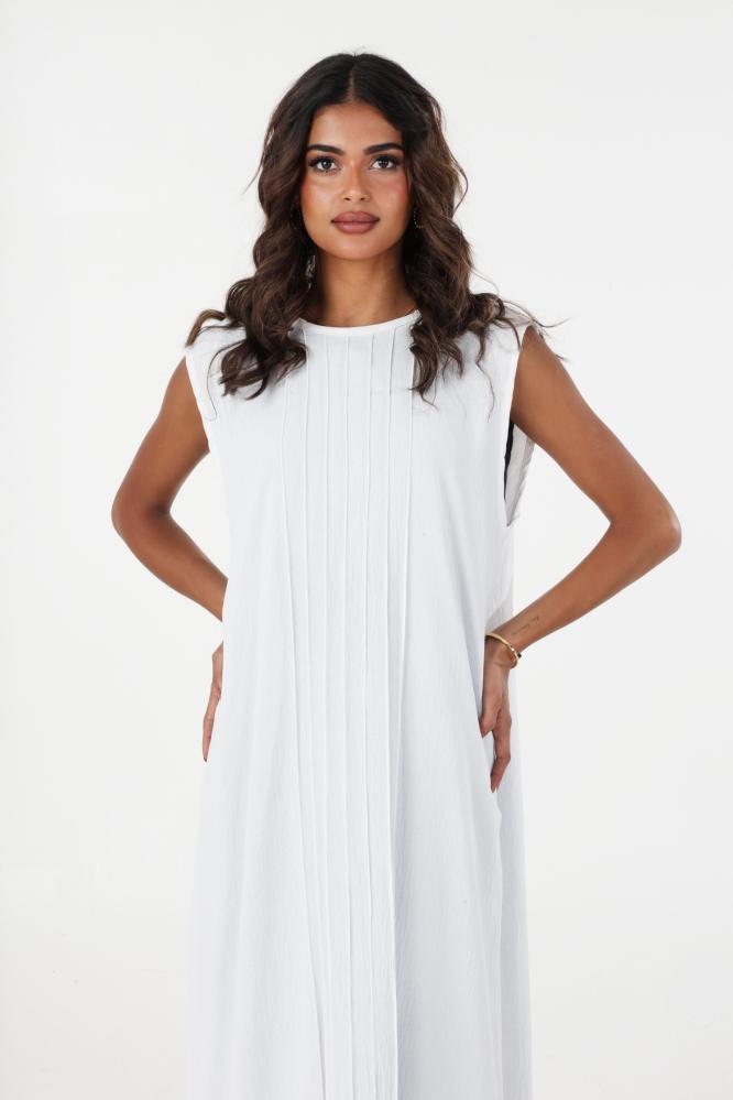 الكسرات تضيف لمسة حيوية للفستان وتمنح القوام شكلًا أنيقًا دون أن تُبرز تفاصيل الجسم، وهو ما يجعل هذا الفستان الخيار المثالي للمرأة الخليجية والعربية الباحثة عن الراحة والستر معًا.