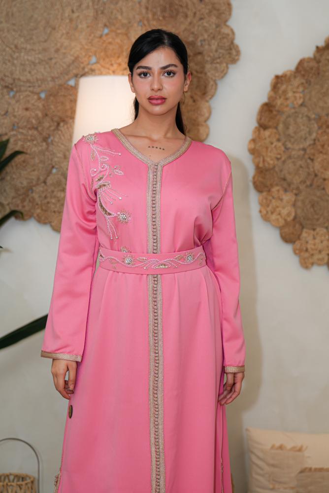 بقماش الكريب الناعم باللون الوردي مع حزام مطرز