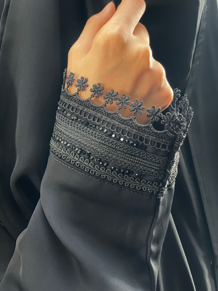 من خامة الندا مقفلة بالطقطق , و الاكمام مزينة بكلفه ناعمه وعلى طرف الطبقات خط فاصل مزين بفصوص من الكريستال الاسود لتعطيى بريقا على الاكمام .